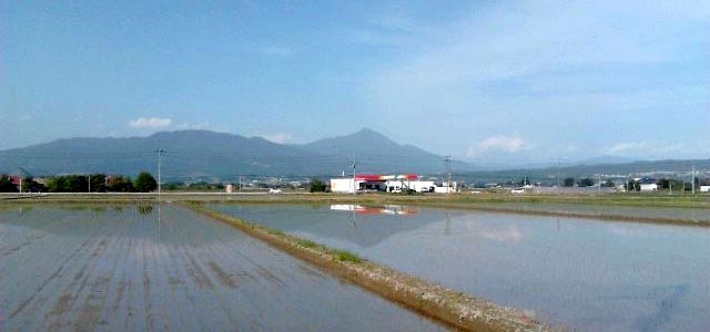 山都の帰り。会津若松市内で「逆さ磐梯山」を発見したので、思わず撮影しました。
