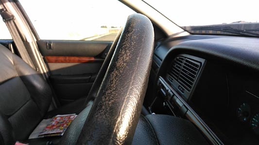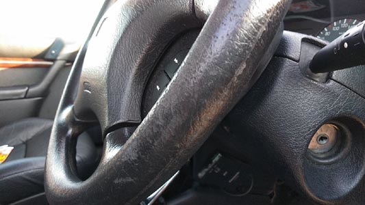 ![]() 今回のお題であるハンドルです。リペア前の状態を撮影しとこうと思いました。 因みにハンドルの素材はウレタンです。シートは革なのにハンドルはウレタン。 |