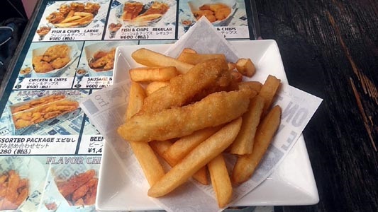 ![]() 浅草駅から六区の方へ。そこで常設の「フィッシュ&チップス」の屋台を見つけ ました。日本で本格的なコレが食べれるなんて!昔ロンドンで食べたっけ。 揚げたてをいただきました。600円。 |