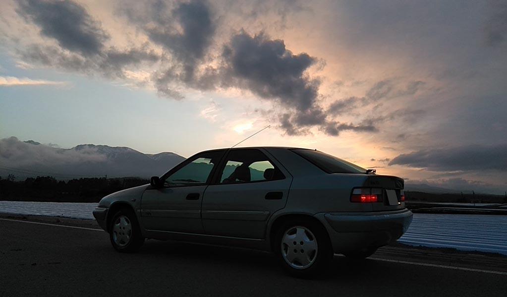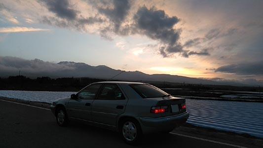 上の写真のアングル違い。八ヶ岳連峰&夕焼けを背景になんかイイ感じの写真が撮れました。エグザンティアのフォルムが美しゅうございます!