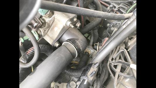 ![]() ラジエター・アッパーホース。ホース類は劣化による破損を予防で交換します。 |