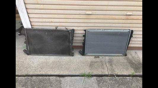 ![]() 作業の様子E ラジエター新旧。経年ラジエターはホースを外す際に受け口の 樹脂部分がサーモスタット・ハウジングの様に破損する可能性が非常に高く、 今回水漏れは無くても交換した次第。因みに耐用年数は一般的に10年弱。 |