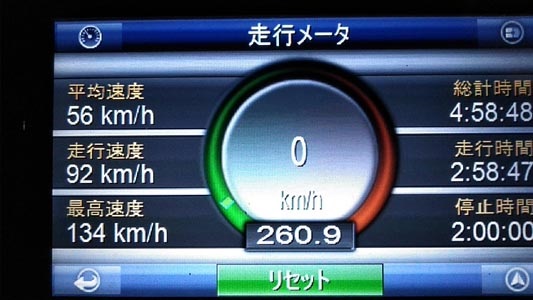 ![]() ナビの復路のドライブデータです。BXスフェアで足回りを柔らかくしたのに、段々 慣れてきて最高速134キロ(メーター読みは140キロ位)出しちゃってます。 日帰りはさすがにキツく、道中2時間近くぶっ倒れてたのが記録されています。 |