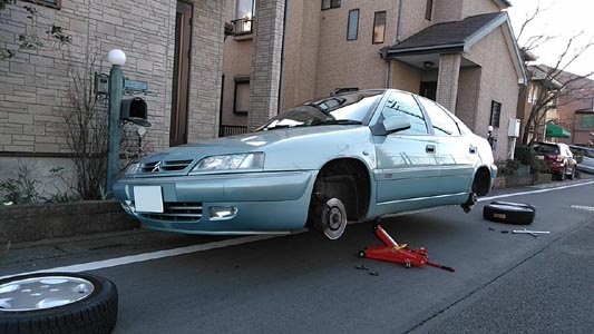 ![]() 思いっきり路上作業・・・。タイヤを全て外す貴重な機会なので、ブレーキパッド とローターの点検を行いました。油圧ジャッキはBX時代の購入品です。 |