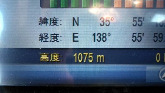 ![]() 神社駐車場で確認したナビの高度計。 走行中に見てると途中の秩父湖から凄い勢いで高度が上がっていきます。 |