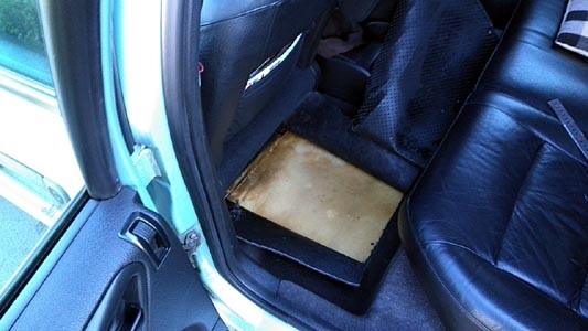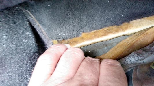 ![]() <2019年7月A>見つけたのは浸水地点至近のタイヤハウスの中の亀裂。 サイドシル構造材を覆っていた樹脂の劣化によるものと思われます。 応急処置でこの穴をガムテープで養生しました。これで一安心。 が、浸水は止まりませんでした。なぜだ?? |
