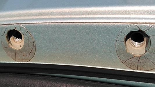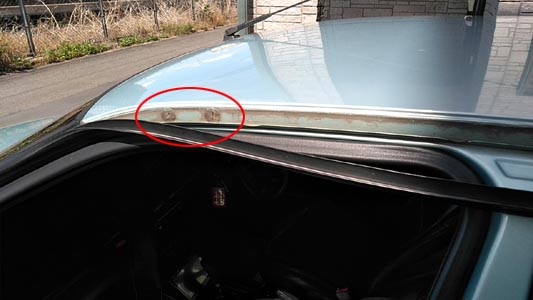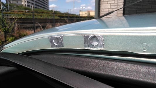 ![]() <2019年6月C>この穴、純正ルーフキャリアの取付穴です。ルーフ付近に 合計8ケ所あります。この穴から雨水が侵入してもおかしくはないですね。 |