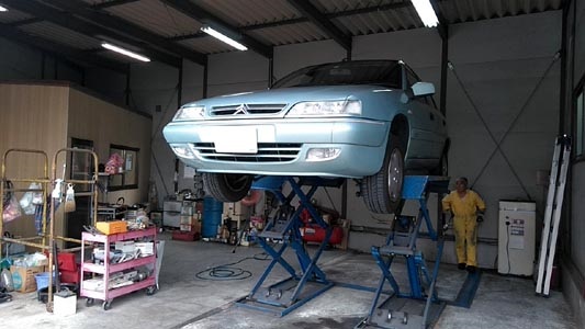 ![]() <2019年7月@>「雨水は下から来るのか?」との仮説を立て、次に取った 手段はリフトアップによる調査。場所は「白ちゃん堂ファクトリー(仮)」。 |