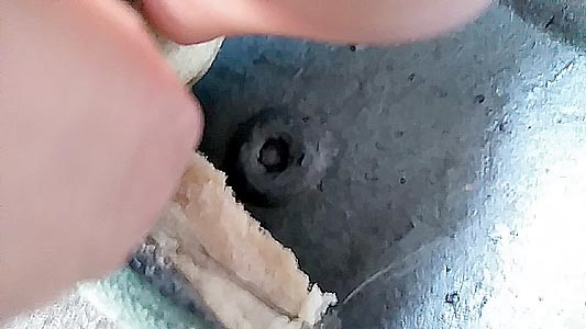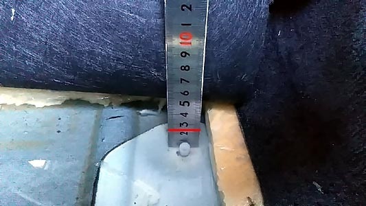 ![]() <2019年10月A>開口部にあたるウレタンを切除、フロアに溜まった雨水の 水深を計測。約2センチでした。この水は雑巾に吸わせ〜絞るを相当数繰り返し 排水。以後、大雨が降るたびに排水作業を繰り返していました。 |