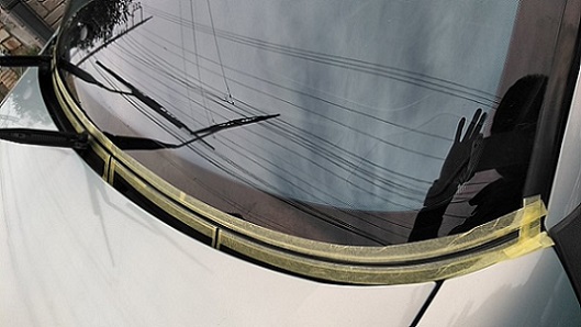 ![]() <2019年12月A>この症状で気になるのは、カウルトップ・カバーの劣化。 カバーがヒビ割れたり(写真では2ケ所)、カバー裏側の接着材が劣化して、 防水機能が落ち、その構造上車内(助手席フロア)への浸水に至ります。 私はエグザンティア1号機でそのトラブルに遭遇しました。 |