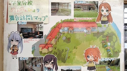 ![]() この廃校を全国的に有名にしたのが、「のんのんびより」というアニメの力。 学校が丸ごとモデルになりました。なお物語の舞台は東京から新幹線or航空機 利用が必須の農村。学校のロケーションのみ使われました。 |
