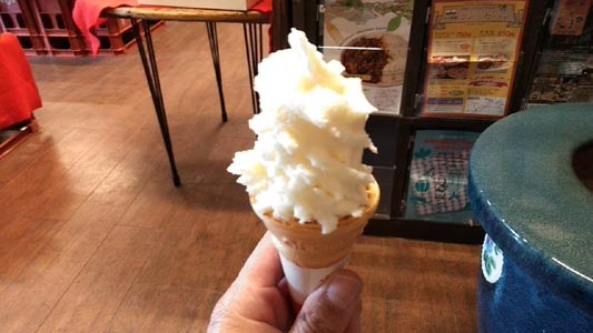 ![]() ここに来ると必ず食べる「大吟醸ソフト」。日本酒っぽい味と香りが◎。 |