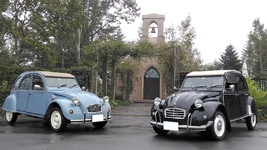 ![]() 翌朝出発前。ホテル内のチャペルの前で2CVをサカナに撮影会。 これは絵になる!凄い!2CVは何処で撮ってもサマになる凄いクルマだ。 |