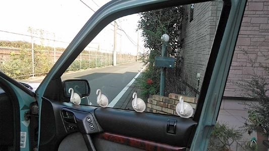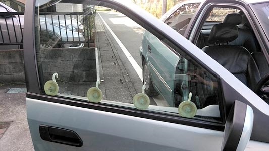 ![]() 吸盤は全て車内側に設置。窓の開閉は無理ですが、しっかり固定されているの で、高速道はフツーに走れます。車庫入れ等バック時はドアを開けて後方確認。 |