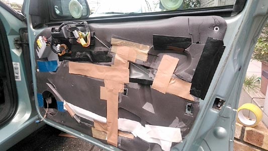 ![]() この日昼前にDanさんと二人で作業開始。サクサク進める為、撮影は最小限。 まず、ドア内貼りを外しました。 |