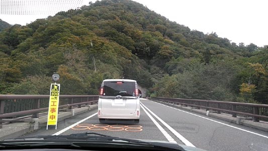 ![]() 東北道は白河ICで下り、甲子トンネルを経由し会津を目指します。 写真は甲子トンネル手前。トンネル内工事の為、待たされています。 |