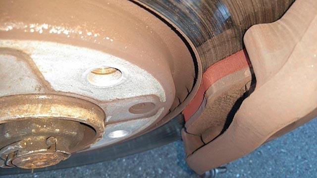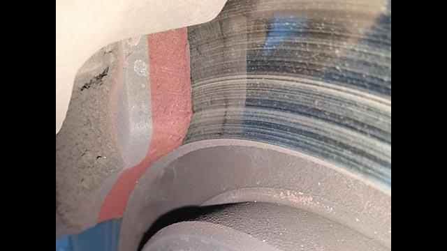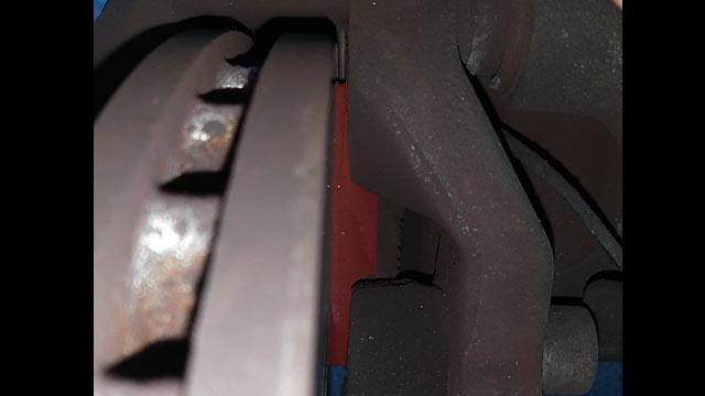 ![]() 右アウター。フロントは片減りする事なく、4枚共順調に減ってますね。 ローターも変なスジがない。リア(対向ピストンタイプ)も問題ありませんでした。 |