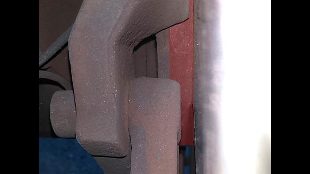 ![]() そして、ブレーキパッドの残量もチェック。これは左インナー。 ライニング部分をフォトショで着色してみました。思ったより減ってない。 |