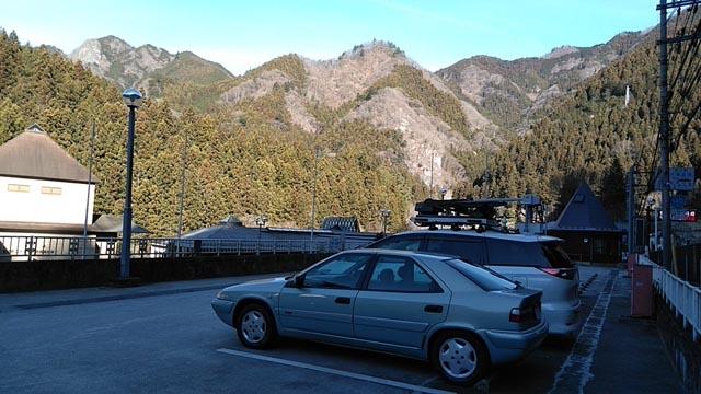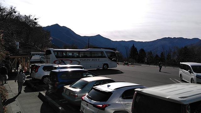 ![]() 三峰神社の駐車場に無事到着しました。奥の山のお名前は〜??→下に続く。 |