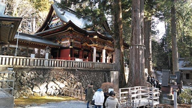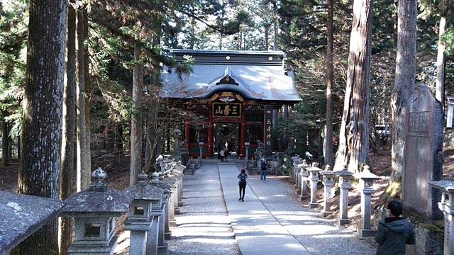 ![]() 駐車場から境内に向かいます。往路は山門をくぐります。今年は全く雪がありませんでした。 |