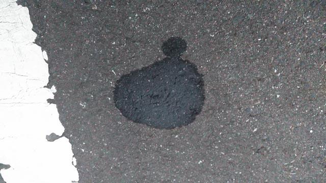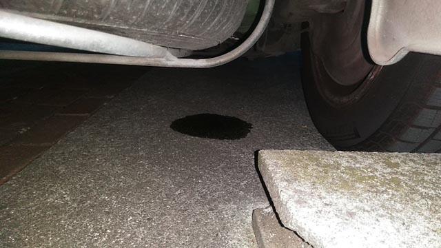 ![]() 続けてガレージの地面を見たら、運転席側後輪の下に、油のお池が出来てました。あ”あ”あ”。 |