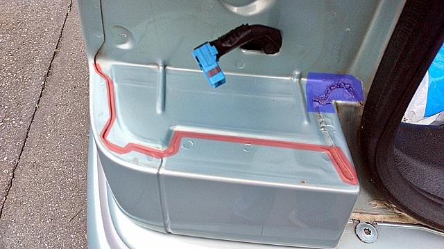 ![]() ウチのエグの抱える問題と言えば「雨漏り」。左側の後席足元に浸水します。 以前対策として、テールランプ取付部(上記写真の青部分)に台所用アルミテープを 貼っていましたが、効力が切れたらしく再発してました。 そこで今回は索敵範囲を拡大し、車体の継ぎ目全体(赤部分)もカバーする事に。 |
